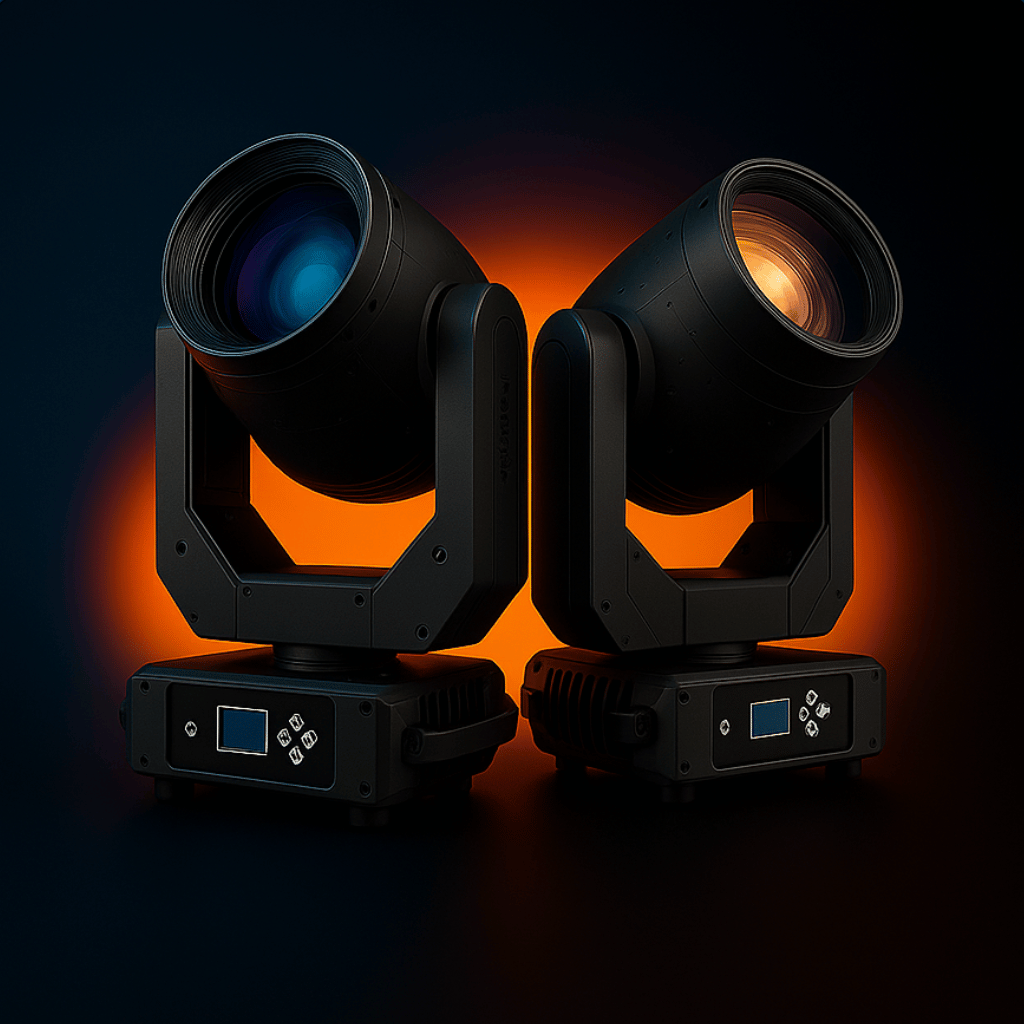 Moving heads, refletores, iluminação cênica, arquitetural.