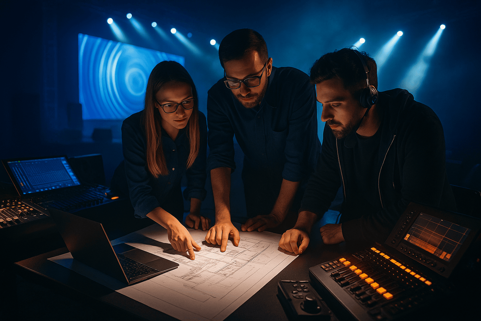 Atuamos com tecnologias profissionais em: Telões e Painéis de LED, Sistemas de Som Profissional, Iluminação Cênica e Arquitetural, Estruturas e Montagem de Palco, Integração Audiovisual e Automação, Operação Técnica, Suporte e Manutenção.
